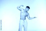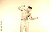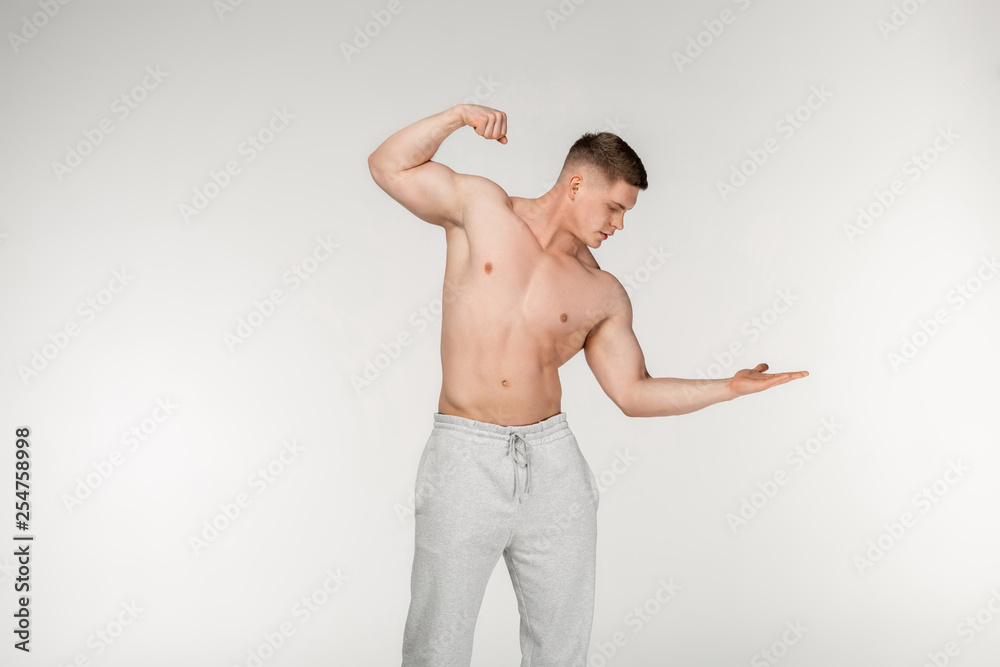 Attractive young bodybuilder motivated look, showing his pumped biceps