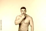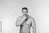 Attractive shirtless sportsman holding his chin and thoughtfully looking at the camera