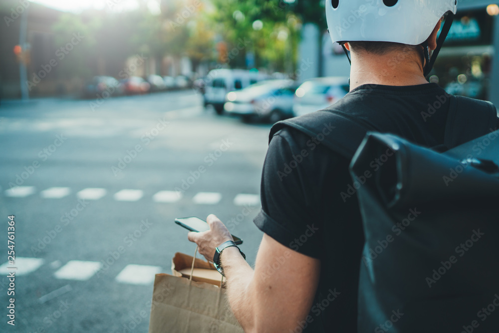 Man courier using a map app on mobile phone to find the delivery address in the city. Anonimous Courier delivery food service at home