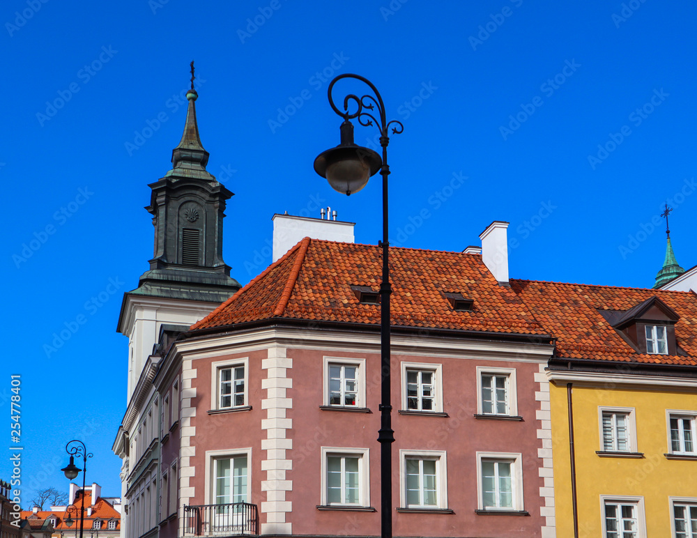 Tower with spire, street lamp and historical buildings of Warsaw, Poland