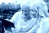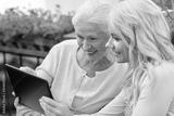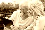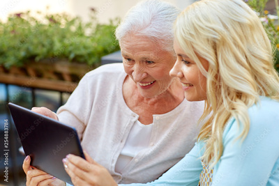 family, technology and people concept - happy smiling young daughter with tablet pc computer and senior mother outdoors