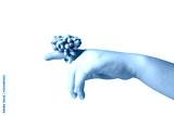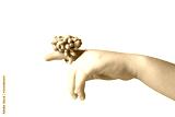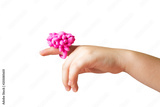 Cute pink princess ring made of modeling dough isolated on finger of small hand of little child. Horizontal color photography.