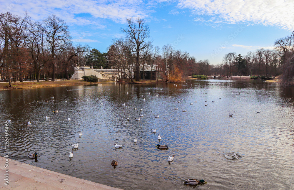Beautiful lake with birds in Royal Baths Park (Lazienki Park) in spring. Warsaw, Poland