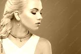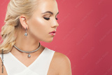 Closeup portrait of perfect blonde woman with luxurious platinum jewelry earrings and necklace with diamond and black pearls on bright pink color background