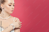 Beautiful woman with silver jewelry, face closeup on colorful pink background with copy space