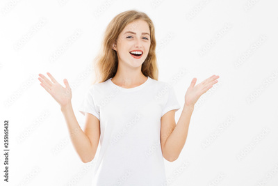 Wow effect. Surprised shocked excited caucasian woman wow face isolated on white background. Young girl in summer t shirt. Copy space