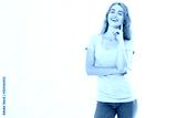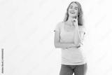 Young blonde woman with fit slim body in blank template t shirt and jeans isolated on white background. Skin and hair care. Copy space and mock up