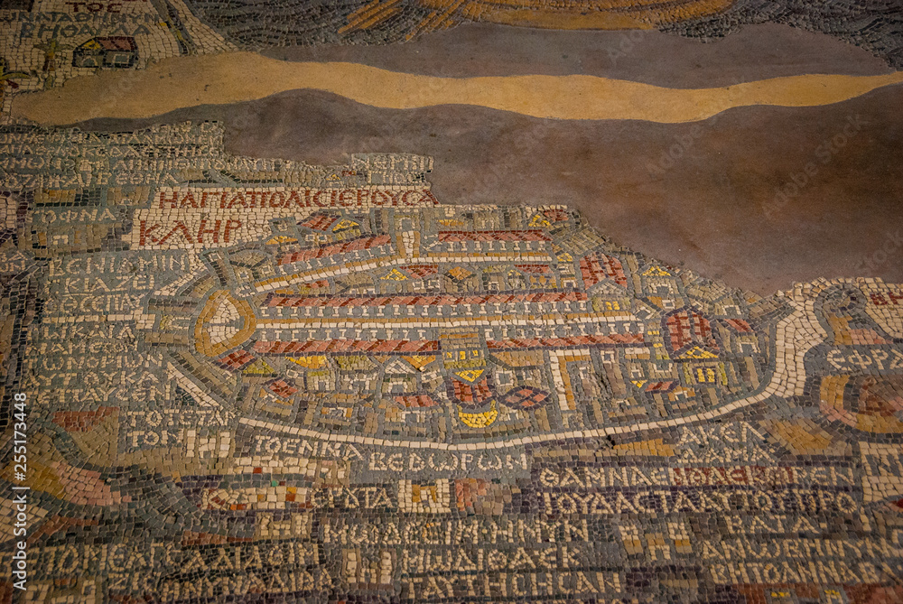 Jordan. Madaba (biblical Medeba) - St. George's Church. Fragment of the oldest floor mosaic map of the Holy Land - the Holy City Jerusalem