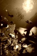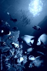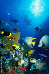 Barracuda, coral, reef fish, and SCUBA diver in Coral Sea, Australia