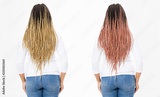 Closeup woman pink dreadlocks and afro braids. African american girl hair style back rear view isolated on white background. Hairstyle and hair care concept. Set banner