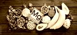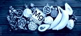 Foods containing natural magnesium. Mg: Chocolate, banana, cocoa, nuts, avocados, broccoli, almonds. Top view. On a blue wooden background.