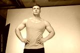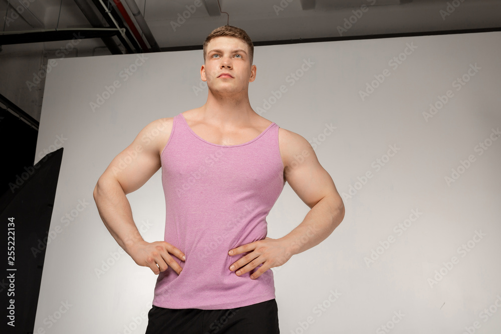 Muscular young man in pink t-shirt posing with hands on belt