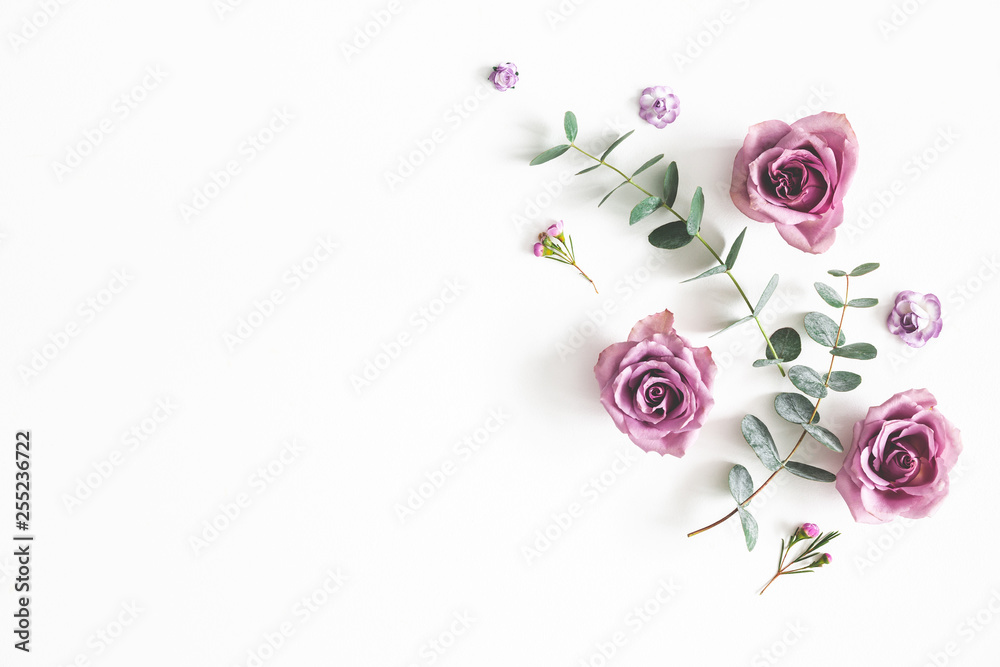 Flowers composition. Pattern made of eucalyptus branches and rose flowers on white background. Flat lay, top view, copy space