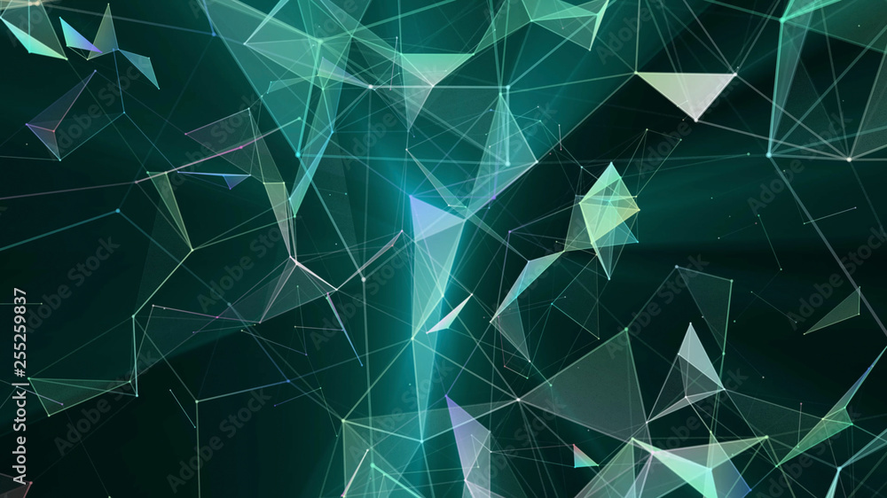 Blue, green lines, plexus abstract background 3D rendering. Digital geometric triangles on black background.