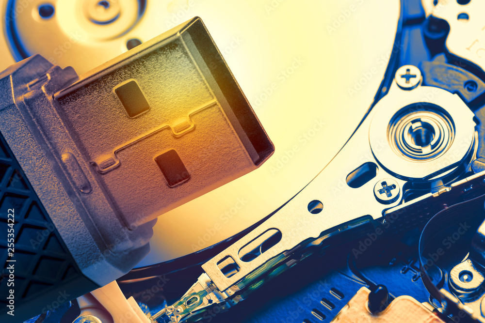 Toned image of USB memory stick against hard disk drive plate background. Technology concept.