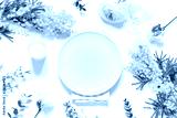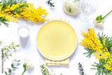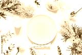 Spring floral table settings with spring flowers. Top view empty plate. Flat lay card. Copy space