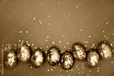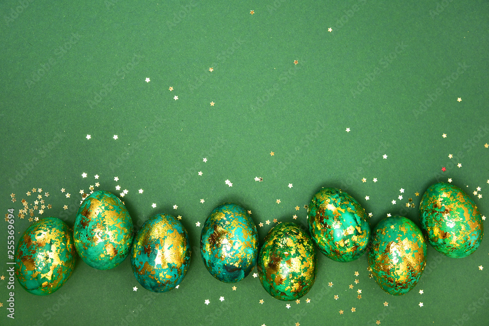 Easter eggs, dark green with gold on a green background. View from above. Flat lay.