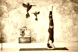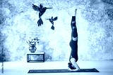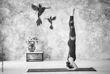 Portrait of attractive woman doing exercises. Brunette with fit body on yoga mat.