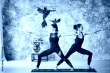 Portrait of attractive woman doing exercises. Brunette with fit body on yoga mat.
