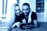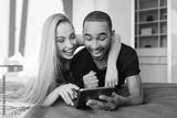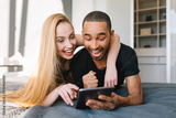 Portrait lovely moments of happy couple of cute young woman with long blonde hair and handsome guy surfing in internet on bed in modern apartment. Having fun, young family, love