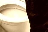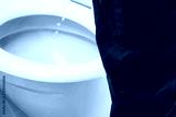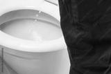man pisses into the toilet while standing, close-up view from behind