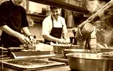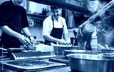 Professional team. Cheerful young cooks preparing food together in a restaurant kitchen