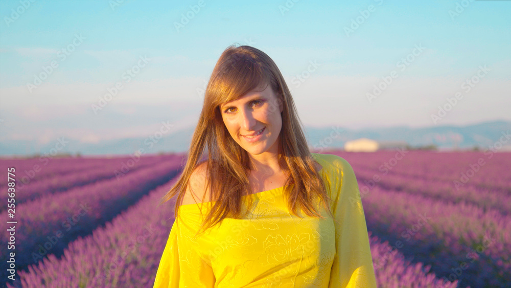 CLOSE UP: Smiling young woman walking through purple lavender field