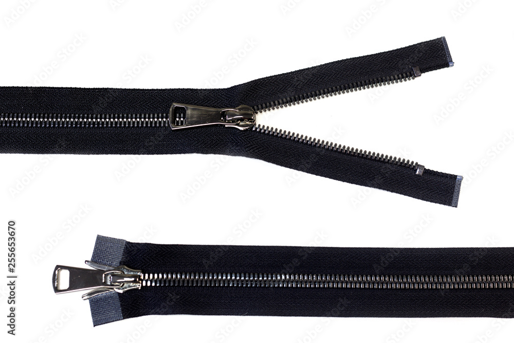 two black sewing zippers. One zipper unzipped