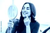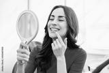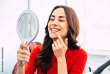 Tooth range. Hilarious girl with long curly hair in the dental chair of tooth center is using a mirror to see the result of the stomatology work which was done perfectly.