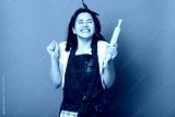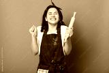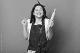 Baker woman holds baking rolling pin, wears brown apron, white t shirt. Young girl bends elbows and shouts yes with closed eyes, female maskes cake first time. Cook isolated on pink background.