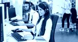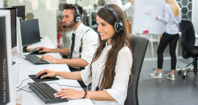 Cheerful customer support operators working in call center. Side view of smiling young business woman and business man talking with clients and solving problems on computers.