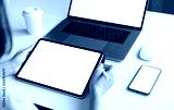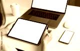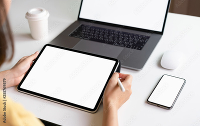 Woman using tablet screen blank and laptop on the table mock up to promote your products. Concept of future and trend internet for easy access to information.