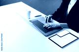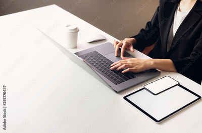 Woman using laptop and tablet, phone placed on the table, mock up of blank screen. Concept of future and trend internet for easy access to information.