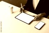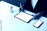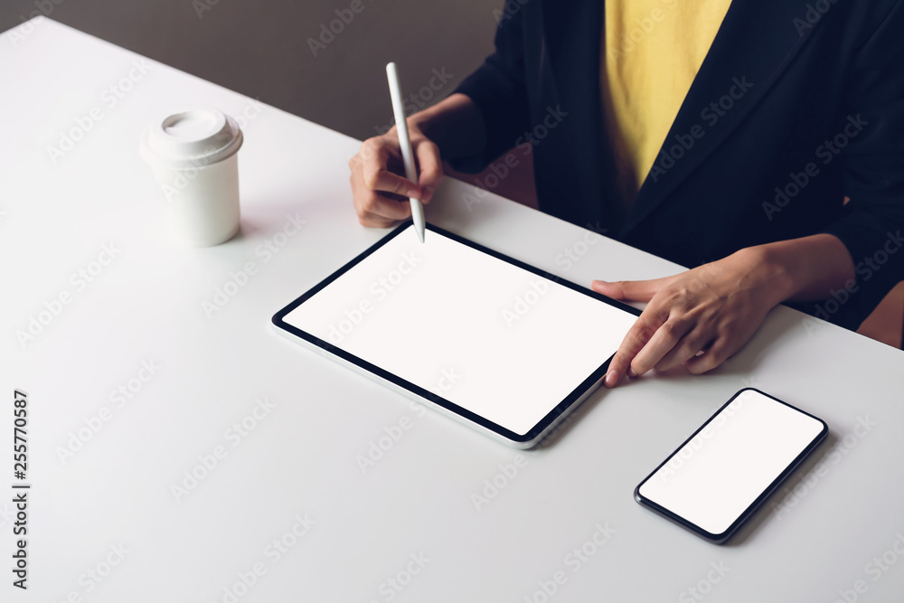 Woman using tablet screen blank and smartphone on the table mock up to promote your products. Concept of future and trend internet for easy access to information.