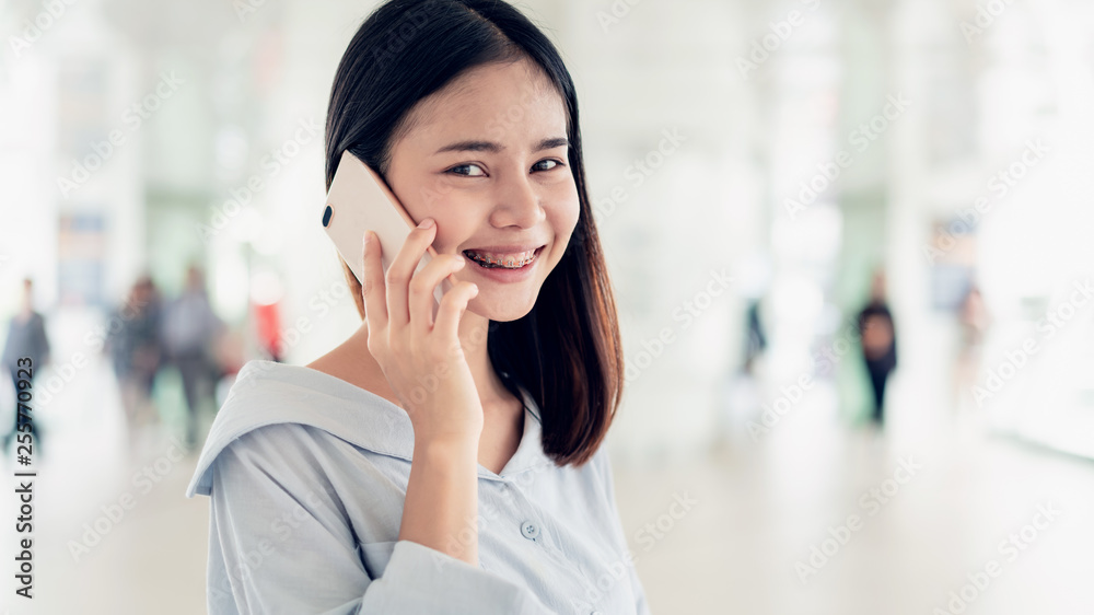 woman using smartphone on staircase in public areas, During leisure time. The concept of using the phone is essential in everyday life.