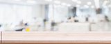 Empty wood table top and blur glass window wall in office building background - can used for display or montage your products.
