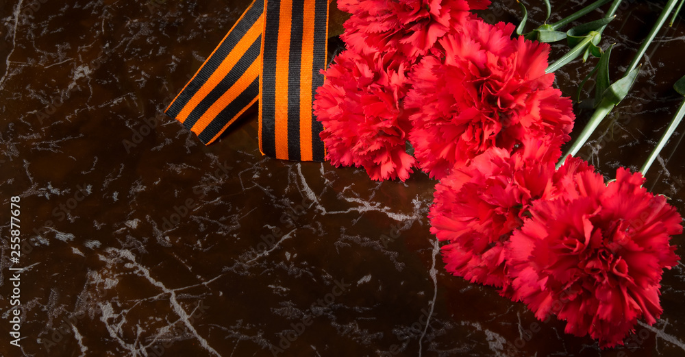 on the marble slab of the monument, there is a bouquet of carnations, St. George's ribbon and on the left there is a place for photos immortal regiment