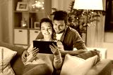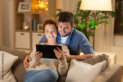 technology, internet and people concept - happy couple using tablet computer at home in evening