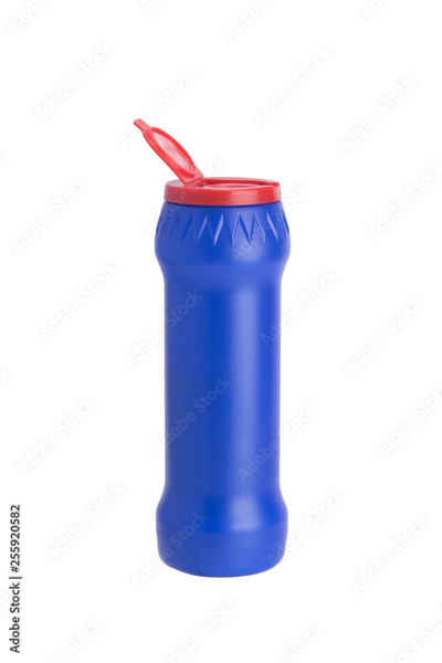 close-up, blue jar with red cover for cleaning surfaces, on white background