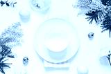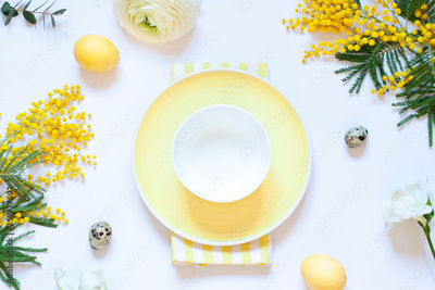 Easter table settings with painted eggs and spring flowers. Top view. Holiday flat lay