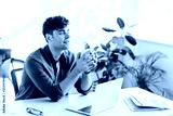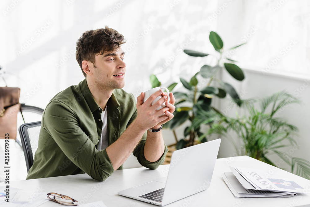 handsome businessman in green shirt sitting, holding cup near table with laptop in office