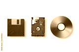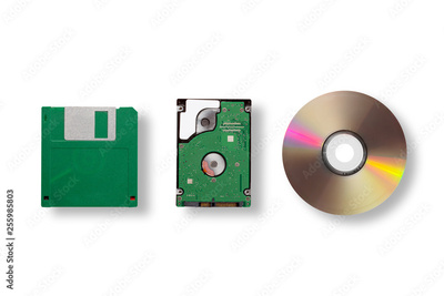 Data storage medium evolution - floppy disk, CD Disk, small hard disk drive isolated on white background. Top view.