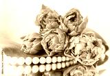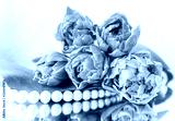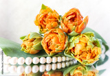 Beautiful orange tulips and white pearls on the mirror. Perfect for background greeting card