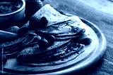 Delicious Tasty Homemade crepes with chocolate or pancakes with raspberries and blueberries on rustic wood