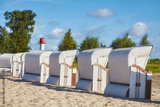 Wicker chairs on an empty beach on a sunny day.