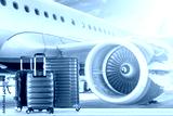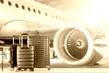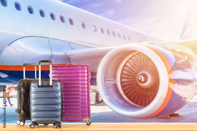 Modern suitcases baggage for travelling or business trip on wooden floor against air plane engine background