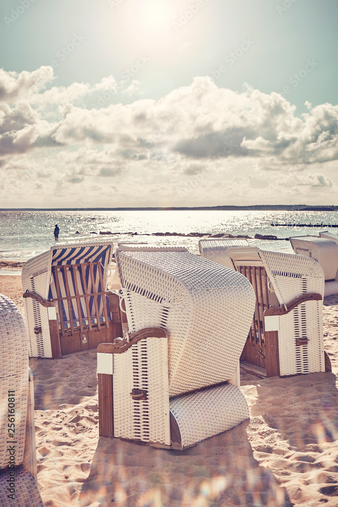 Retro stylized picture of wicker beach chairs on a beach against the sun with lens flare.