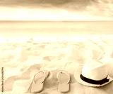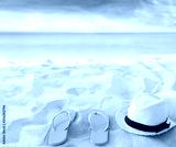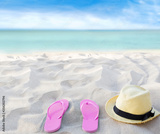 Beach summer holiday background. Flip flops and hat on sand near ocean. Summertime accessories on seaside. Tropical vacation and relax travel concept. Top view and copy space. Selective focus
