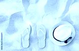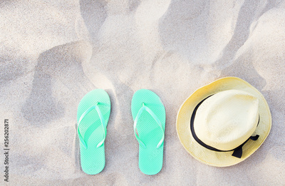 Summer accessories on beach texture banner background. Flip flops and hat on sand top view. Slippers shoes and vacation holiday concept. Copy space. Selective foucus