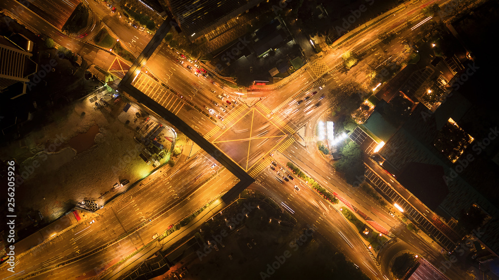 Aerial view of highway junctions shape letter x cross at night. Bridges, roads, or streets in transportation concept. Structure shapes of architecture in urban city, Kuala Lumpur Downtown, Malaysia